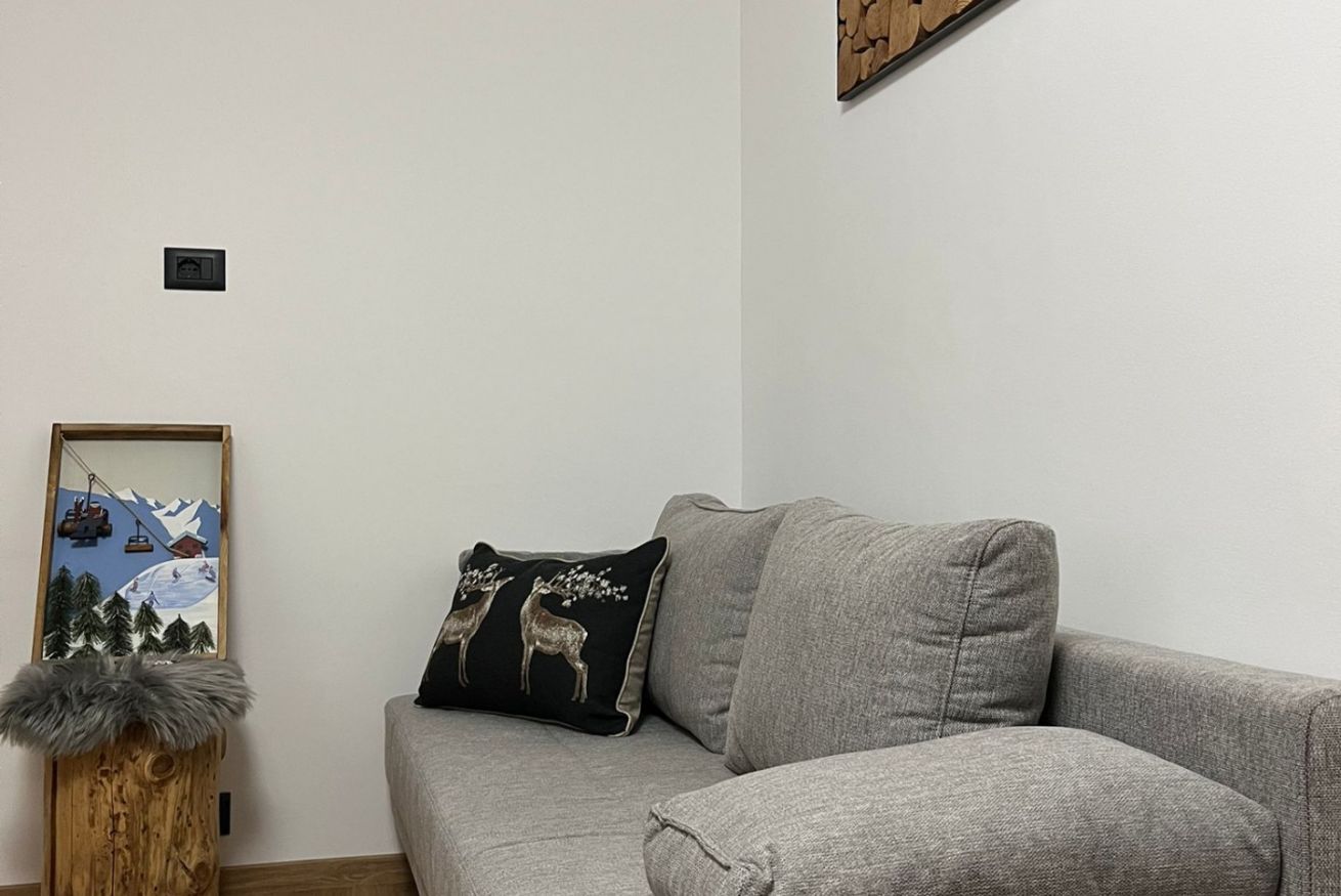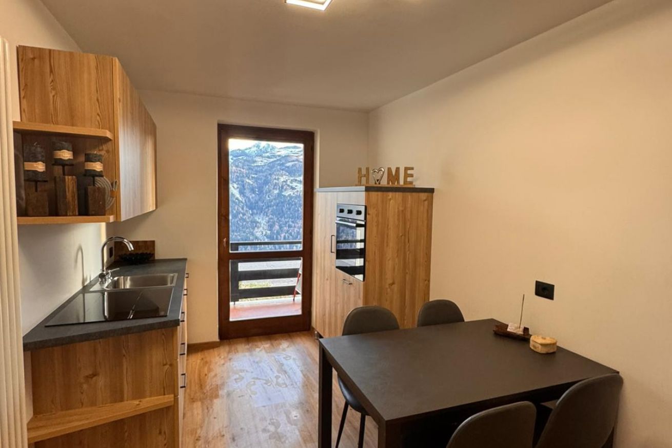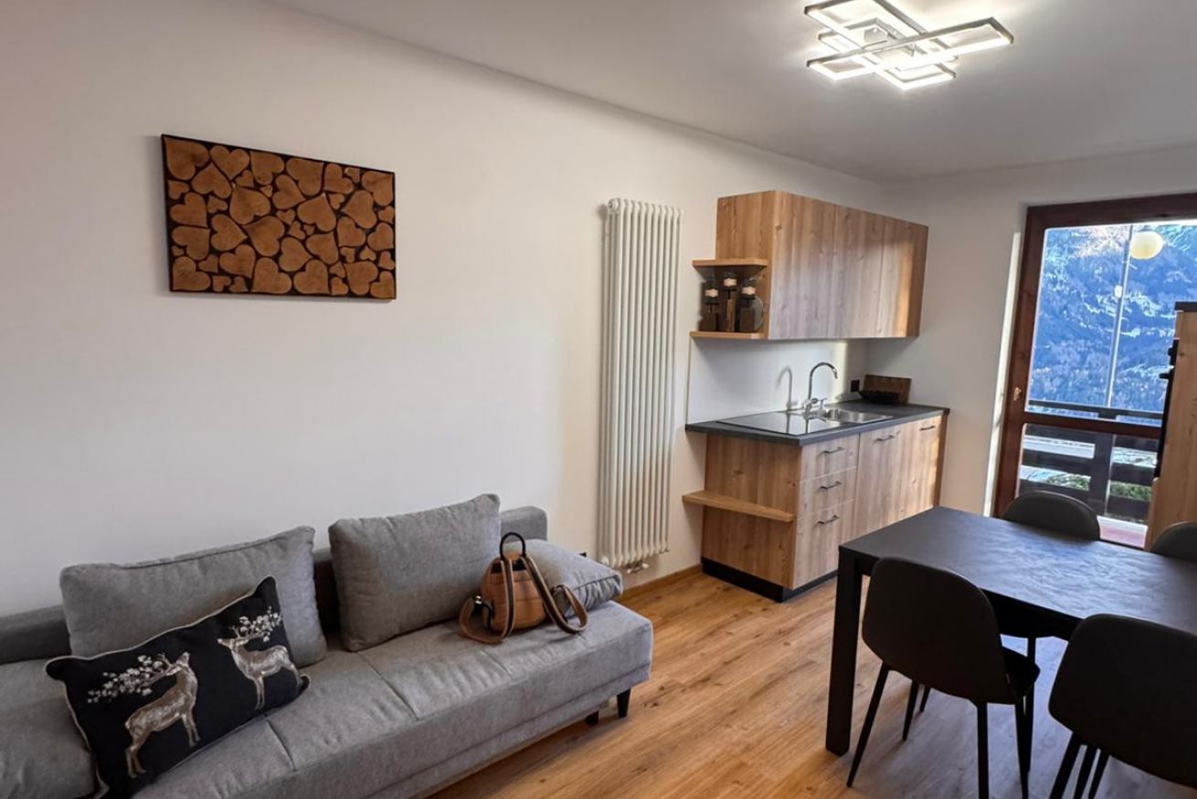 L'appartamento è composto di zona living con televisione, cucina attrezzata, una camera matrimoniale, una camera con letto a castello, bagno con doccia, ampio balcone con vista mozzafiato, posto auto privato in garage, deposito per sci e biciclette.